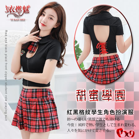 甜蜜學園!紅黑格紋前拉鍊學生角色扮演服
