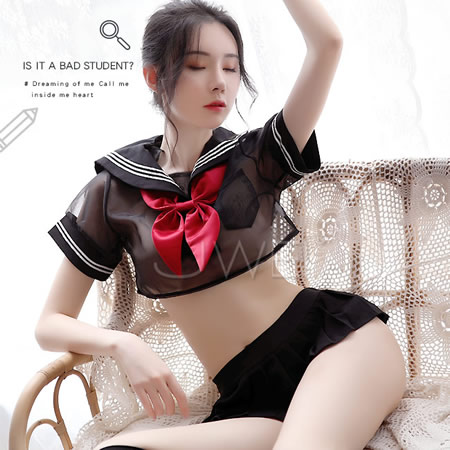 學生角色扮演服!透視襯衫格子百褶裙五件式套裝﹝深藍格﹞