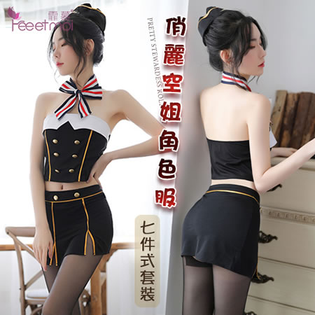 俏麗空姐角色扮演服!條紋領巾翻邊平口露腰七件式套裝